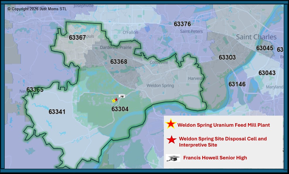 These areas are located near historical uranium processing and transport routes from when the Downtown Mallinckrodt Uranium Processing facility moved to Weldon Spring.