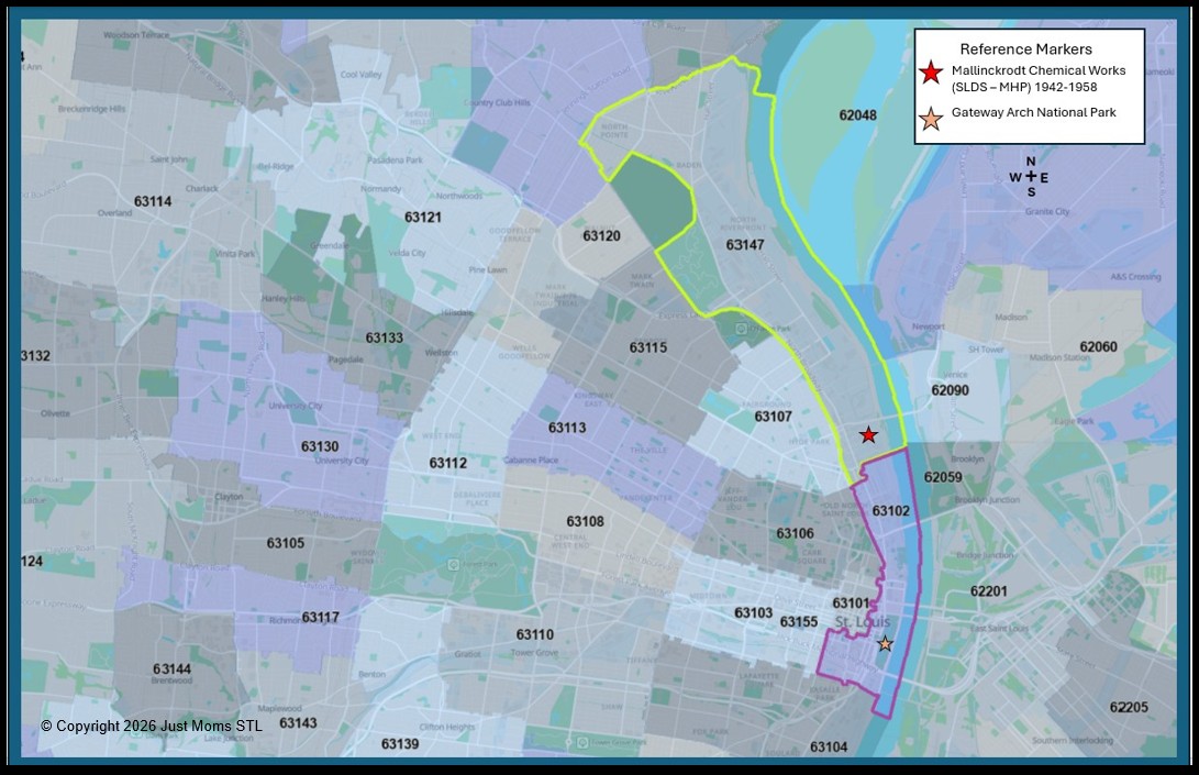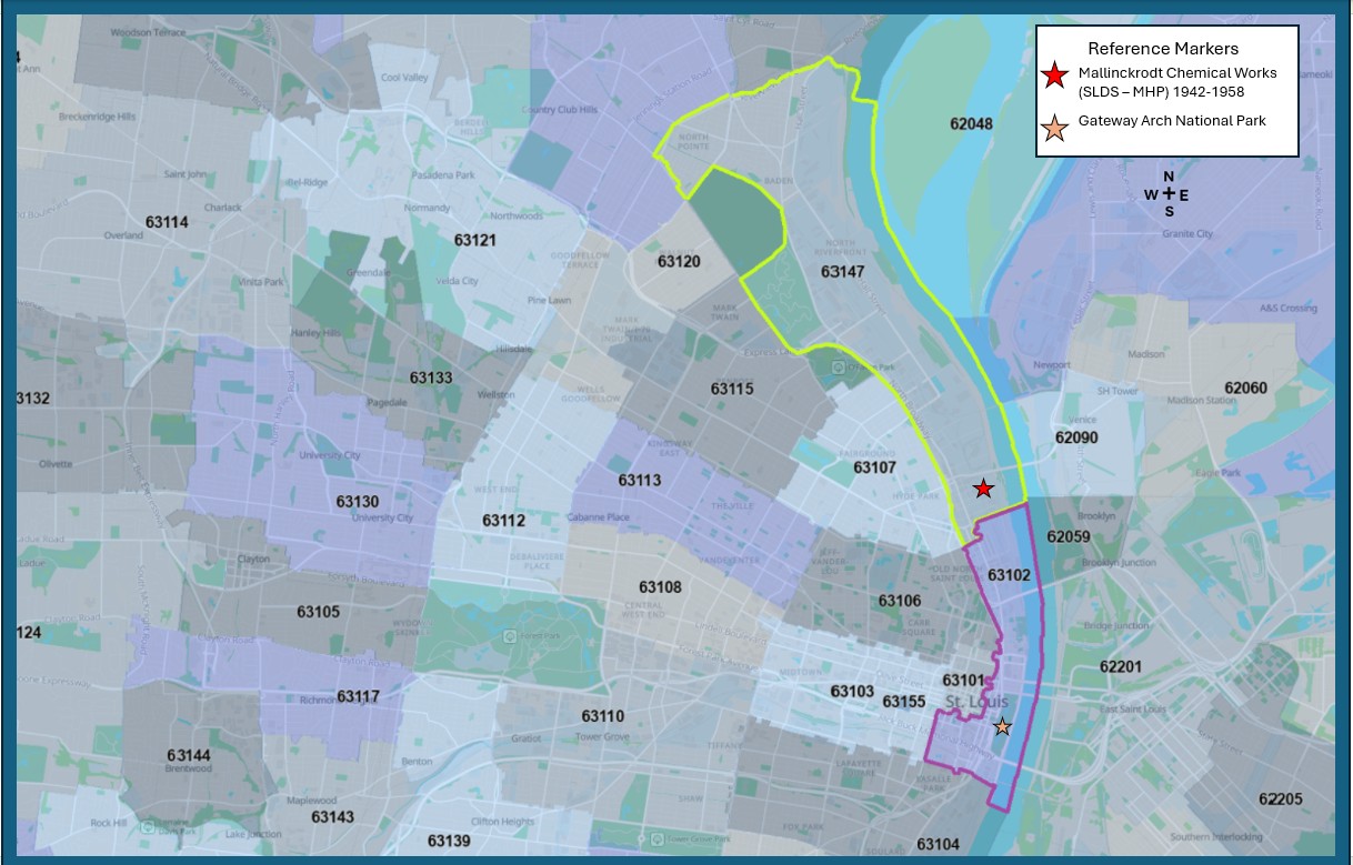 This area has long been impacted by radioactive contamination linked to the Downtown Mallinckrodt uranium processing facility and its associated waste transportation routes, which passed directly through these communities enroute to sites such as Coldwater Creek and West Lake Landfill.